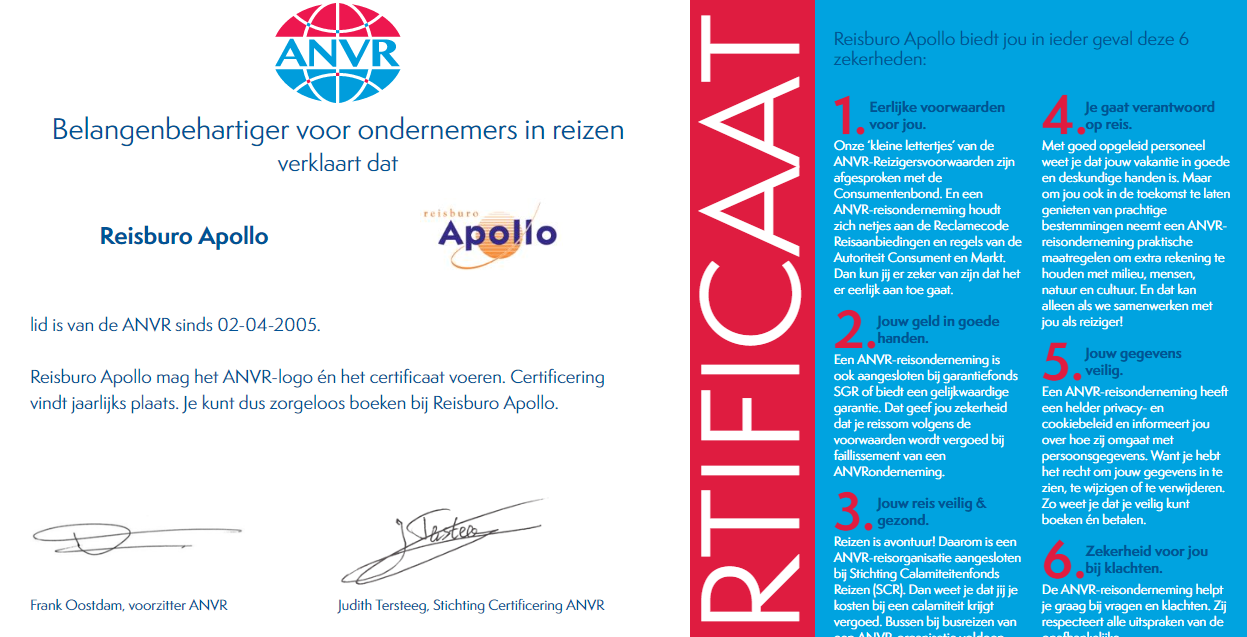 - Travelshop werkt samen met Reisburo Apollo, aangesloten bij ANVR en SGR dus veilig en vetrouwd boeken.